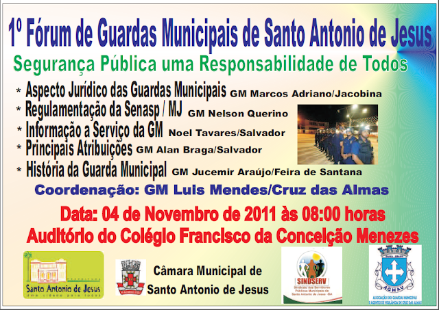 Temos o prazer de convida-los para o I Fórum de Guardas Municipais de Santo Antonio de Jesus - BA, evento de grande importância para este municipio e que teremos prazer em recepciona-los. Com certeza é de fundamental importância dos senhores para abrilhantar o nosso evento.